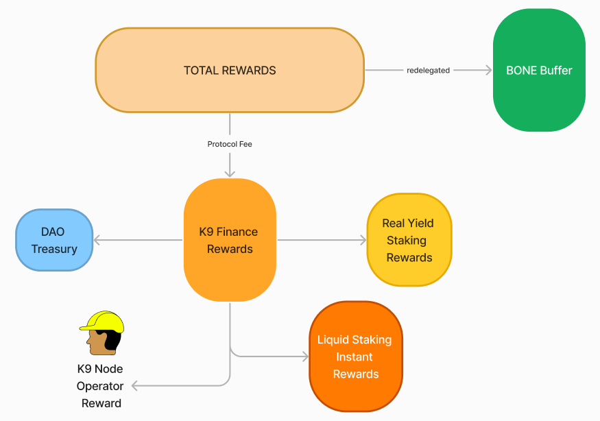 Validation rewards that K9 Finance DAO receives are split into five parts: